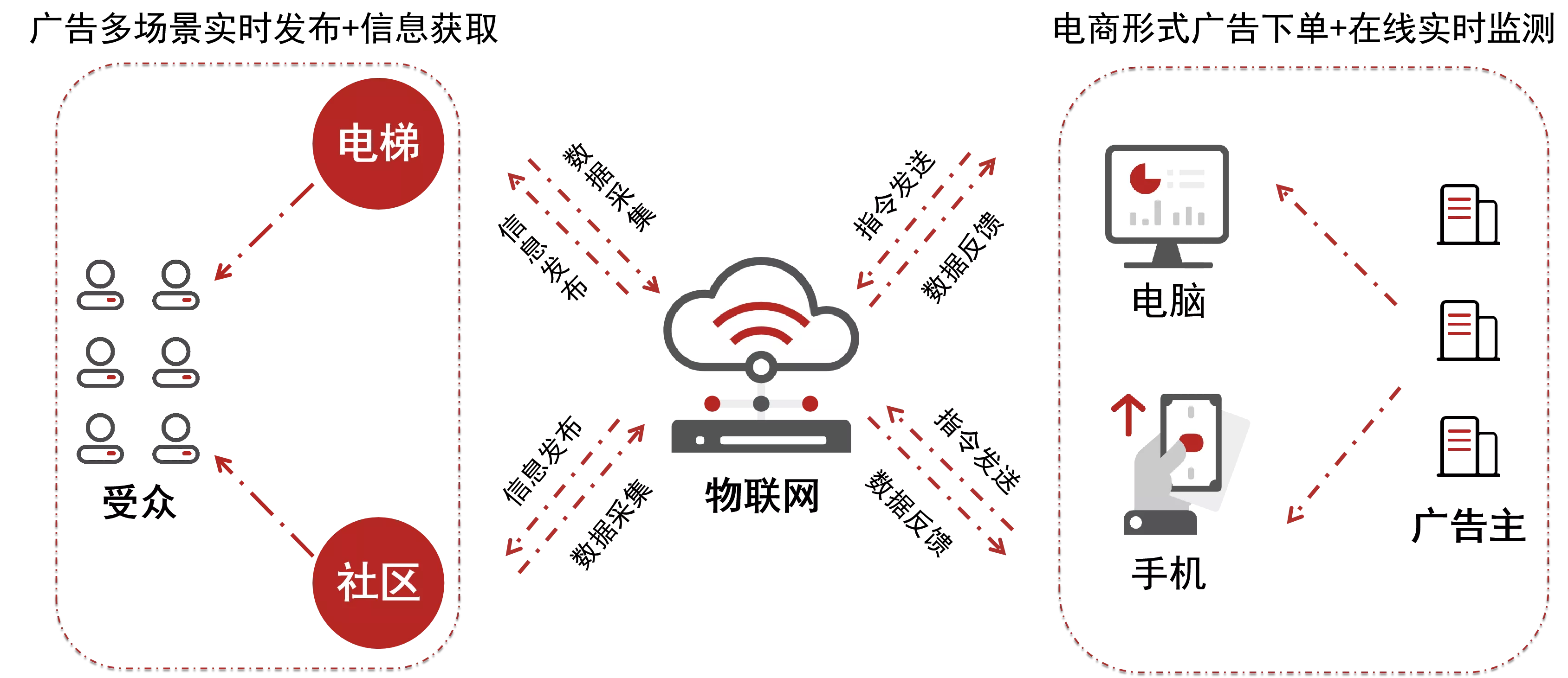 公司拥有专利的物联网媒体设备,通过自主研发的物联网技术设备,链接广告主、硬件设备(手机、电脑等)、媒体终端、受众,颠覆传统未联网的线下广告屏幕,实现线下广告线上投放,节约大量人工成本,高效便捷、投放灵活、数据精准。